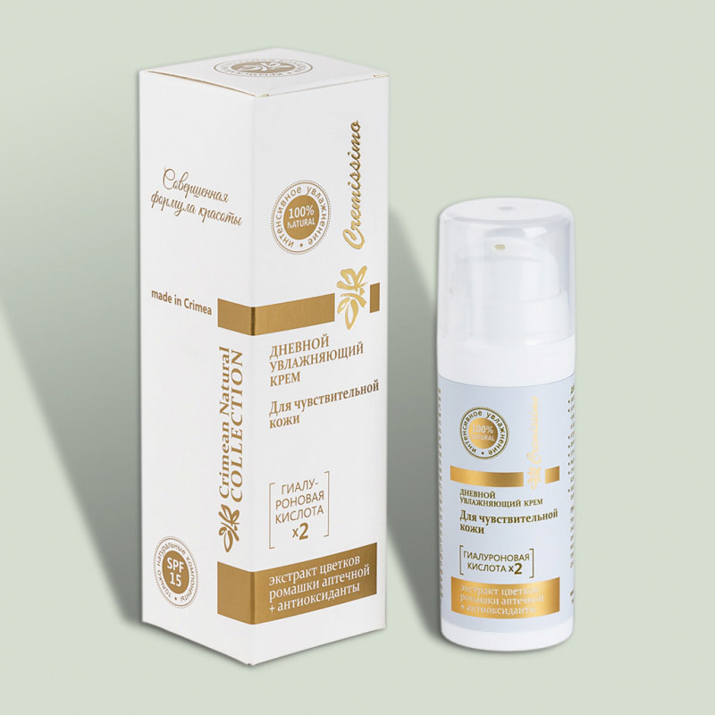 Дневной увлажняющий крем серии Cremissimo на основе гиалуроновой кислоты для чувствительной кожи с экстрактом цветков ромашки аптечной, комплексом антиоксидантов увлажняет и успокаивает, снижает чувствительность и раздражительность кожи, регенерирует, улучшает рельеф, выравнивает цвет лица, стимулирует синтез коллагена, защищает от образования свободных радикалов.