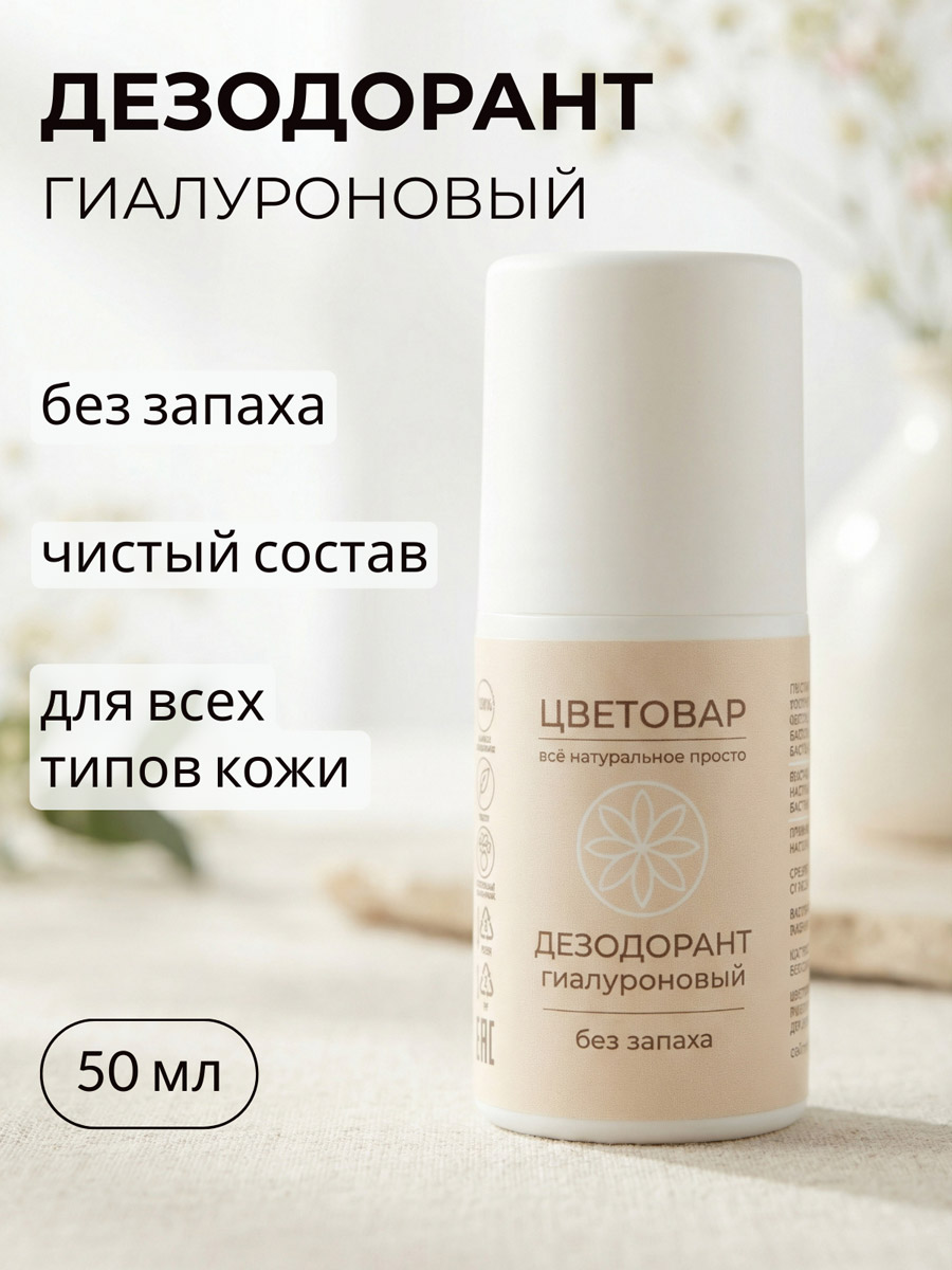 Шариковый гиалуроновый дезодорант "Цветовар" не имеет запаха. Гелевая текстура быстро впитывается и не оставляет следов на одежде.