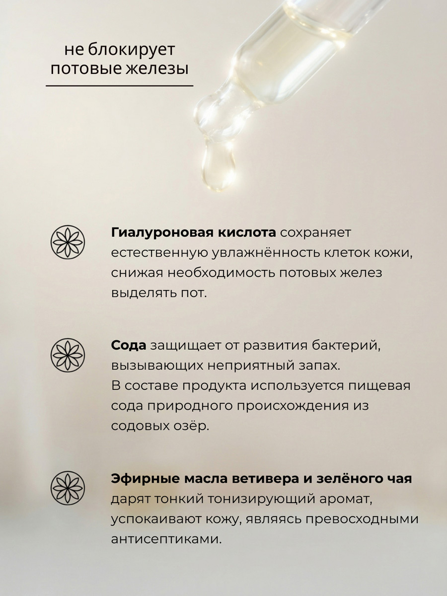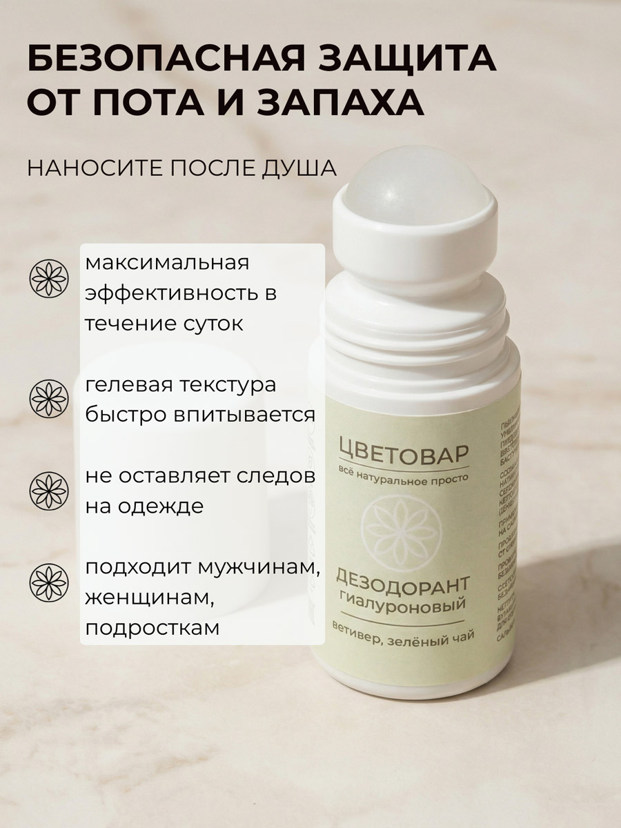 Шариковый гиалуроновый дезодорант "Цветовар" обладает тонким тонизирующим ароматом композиции эфирных масел ветивера и зелёного чая. Гелевая текстура быстро впитывается и не оставляет следов на одежде.