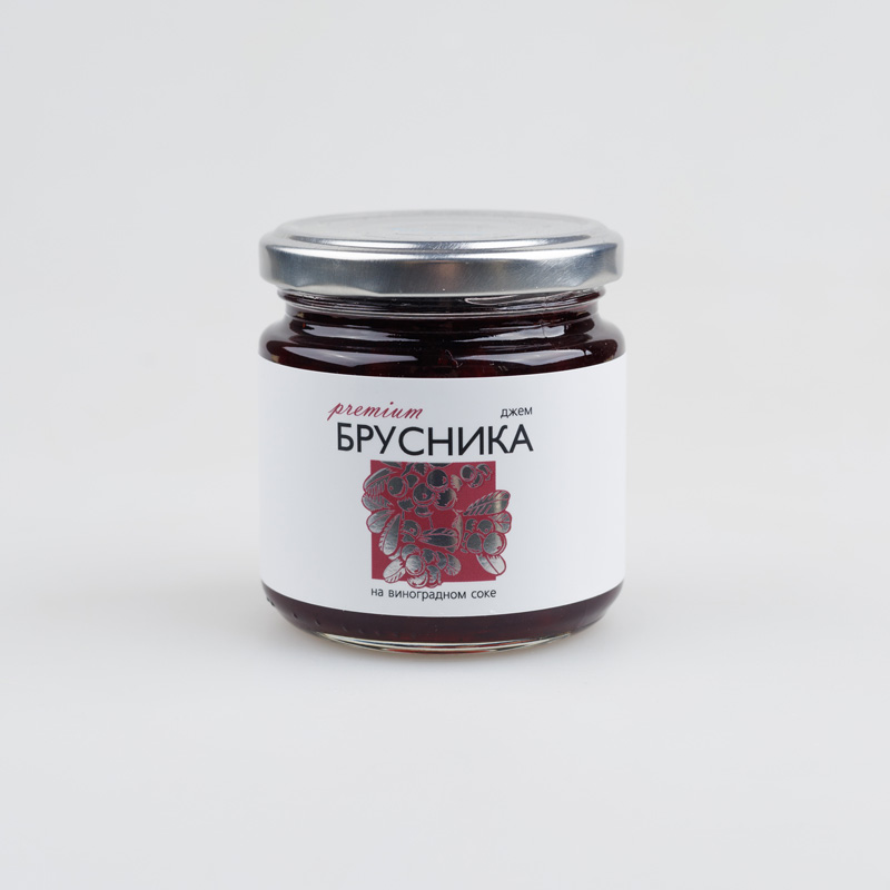 Джем "Русский лес" изготовлен из спелых ягод брусники, с добавлением приятного на вкус виноградного сока и натурального пектина.