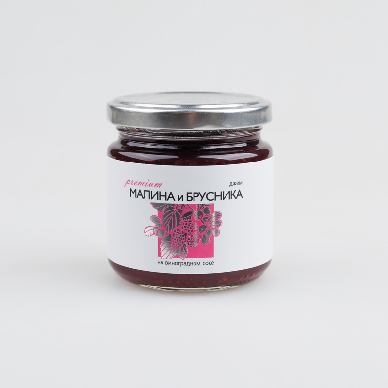 Джем "Русский лес" изготовлен из спелых ягод малины и брусники, с добавлением приятного на вкус виноградного сока и натурального пектина.