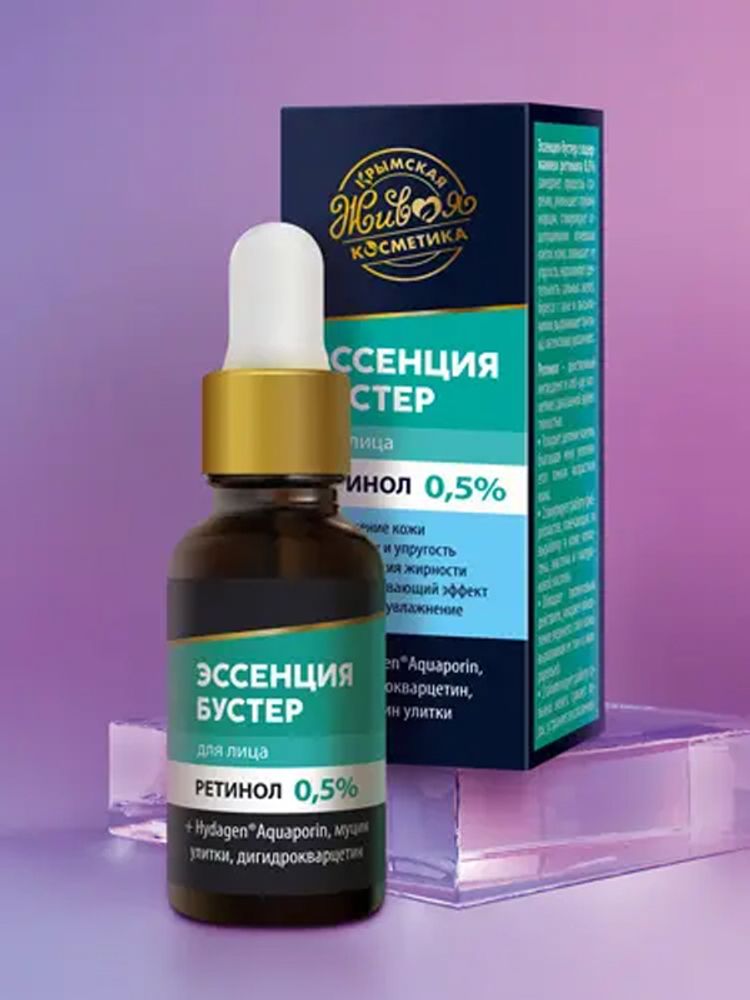 Эссенция-бустер с содержанием ретинола 0.5% замедляет процессы старения, уменьшает глубину морщин, стимулирует отшелушивание отмерших клеток кожи, повышает ее упругость, нормализует деятельность сальных желез, борется с акне и высыпаниями, выравнивает тон лица, интенсивно увлажняет.