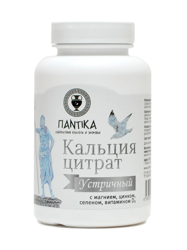 Кальция цитрат Устричный с магнием, цинком, селеном и витамином D3 изготавливается в цитратной форме исключительно из очищенных створок крымских устриц. Преимущество данного вида кальция обусловлено наличием в нём богатого спектра микроэлементов, который откладывается в створках устриц при их жизнедеятельности.