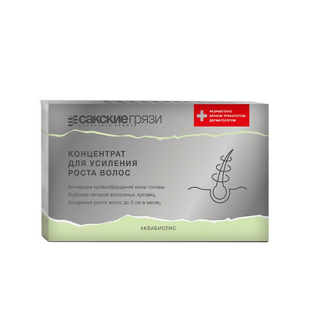 Концентрат для усиления роста волос в ампулах использует целительное действие лечебных грязей. Отжим грязи Сакского озера (АКВАБИОЛИС) активизирует кровообращение вокруг волосяных фолликул, тем самым укрепляя и стимулируя активный рост волос, предотвращая их выпадение и насыщая корни витаминами, что увеличивает густоту. Помогает восстанавливать поврежденные волосы, защищать их от разрушения и вредного воздействия, предотвращает выпадение волос. Стимуляция роста обеспечивается благодаря активизации кровообращения в клетках кожи головы. Волосы становятся более густыми и сильными. Растительные компоненты поддерживают и сохраняют силу и блеск волос.