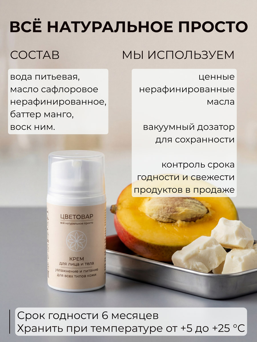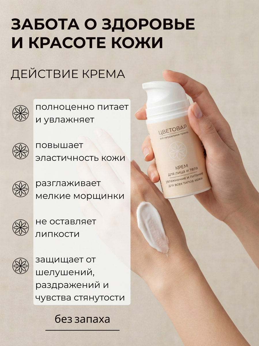 Крем "Цветовар" полноценно питает и увлажняет кожу, повышает её эластичность. Лёгкий травянисто-ореховый аромат после впитывания не улавливается.