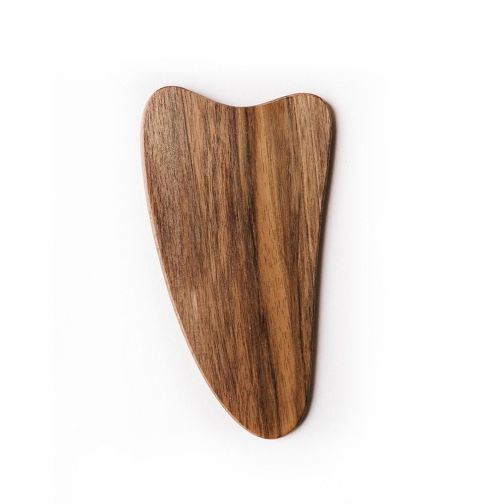Скребок-массажёр из дерева грецкого ореха без какого-либо покрытия. Плавные изгибы и гладкие линии скребка позволяют функционально задействовать в массаже все грани пластины.