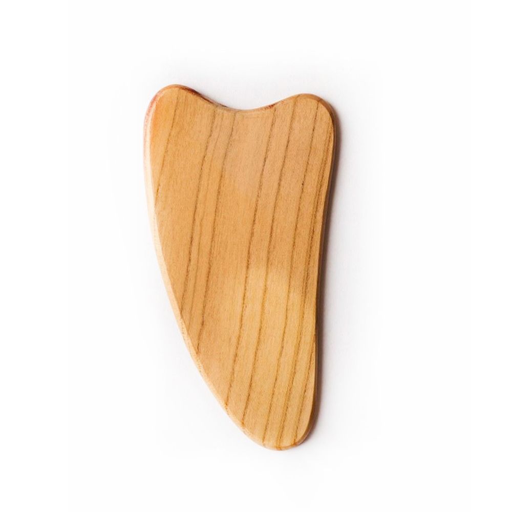 Скребок-массажёр из абрикосового дерева без какого-либо покрытия. Плавные изгибы и гладкие линии скребка позволяют функционально задействовать в массаже все грани пластины.