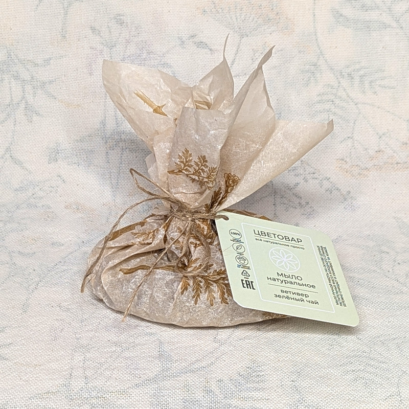 Крафтовая обёртка подчёркивает уникальность каждого кусочка мыла, сформованного вручную.