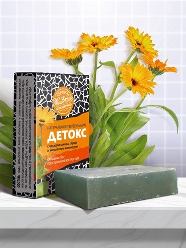Твердое натуральное мыло «Детокс» для для жирной, комбинированной и проблемной кожи. Прекрасно подходит для умывания, очищает кожу и поры от омертвевших клеток, загрязнений и макияжа, борется с черными точками, акне и комедонами, обладает матирующим эффектом.