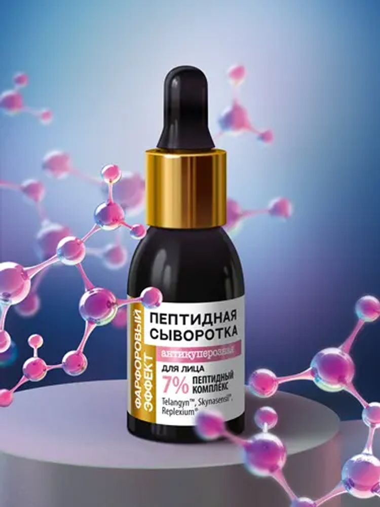 Сыворотка для лица с комплексом пептидов уменьшает выраженность сосудистой сетки, укрепляет капилляры, снимает раздражение и покраснение, улучшает общий тон кожи, повышает ее прочность и эластичность, разглаживает морщинки, устраняет следы пост-акне и пигментацию.