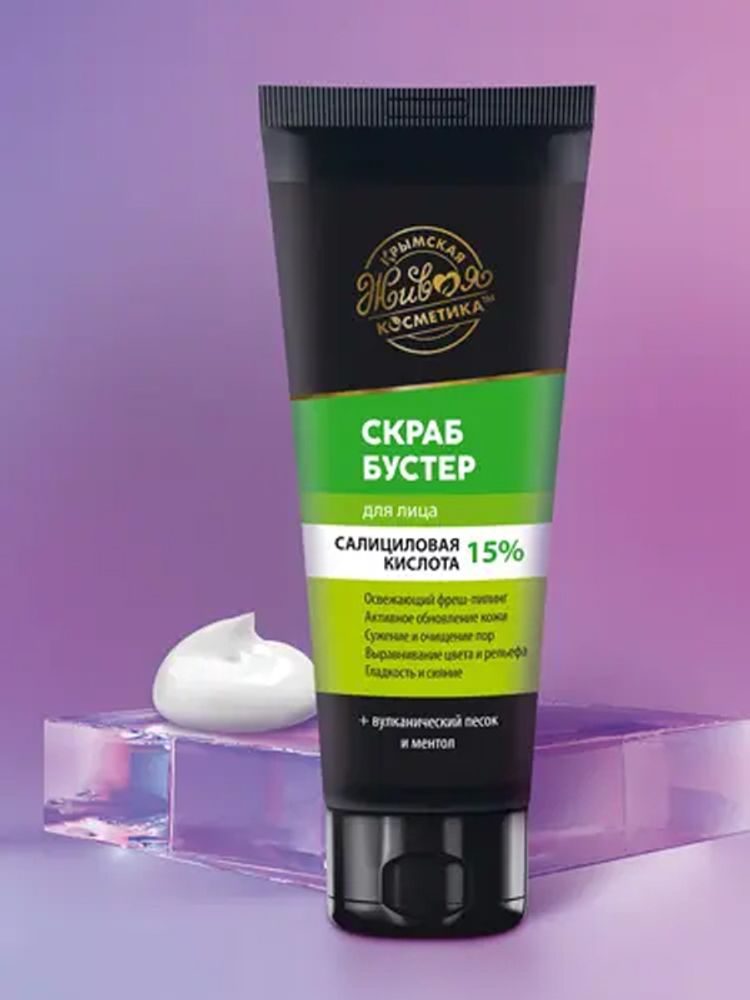 Скраб-бустер с содержанием салициловой кислоты 15% бережно очищает кожу от ороговевших клеток, излишков жира и токсинов, делает ее гладкой и сияющей, освежает и тонизирует, сужает поры, стимулирует регенерацию.