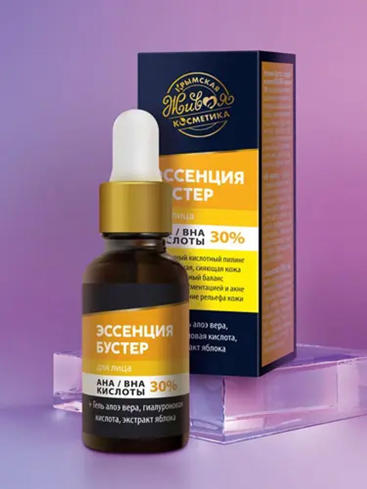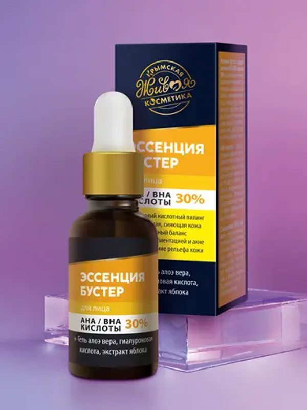 Эссенции-бустеры ТМ "Крымская живая косметика" крымского производителя "Царство ароматов" – концентрированное косметическое средство с повышенным содержанием ключевого активного ингредиента. Облегченная формула на водной основе без содержания жирных масел позволяет эссенции быстро впитываться, не оставляя ощущения пленки на лице и не перегружая кожу, глубоко проникать в эпидермис, благодаря чему она оптимизирует обновление клеток кожи, оказывает отшелушивающее, смягчающее, увлажняющее и тонизирующее действие, усиливает работу и улучшает свойства средств дальнейшего ухода.
